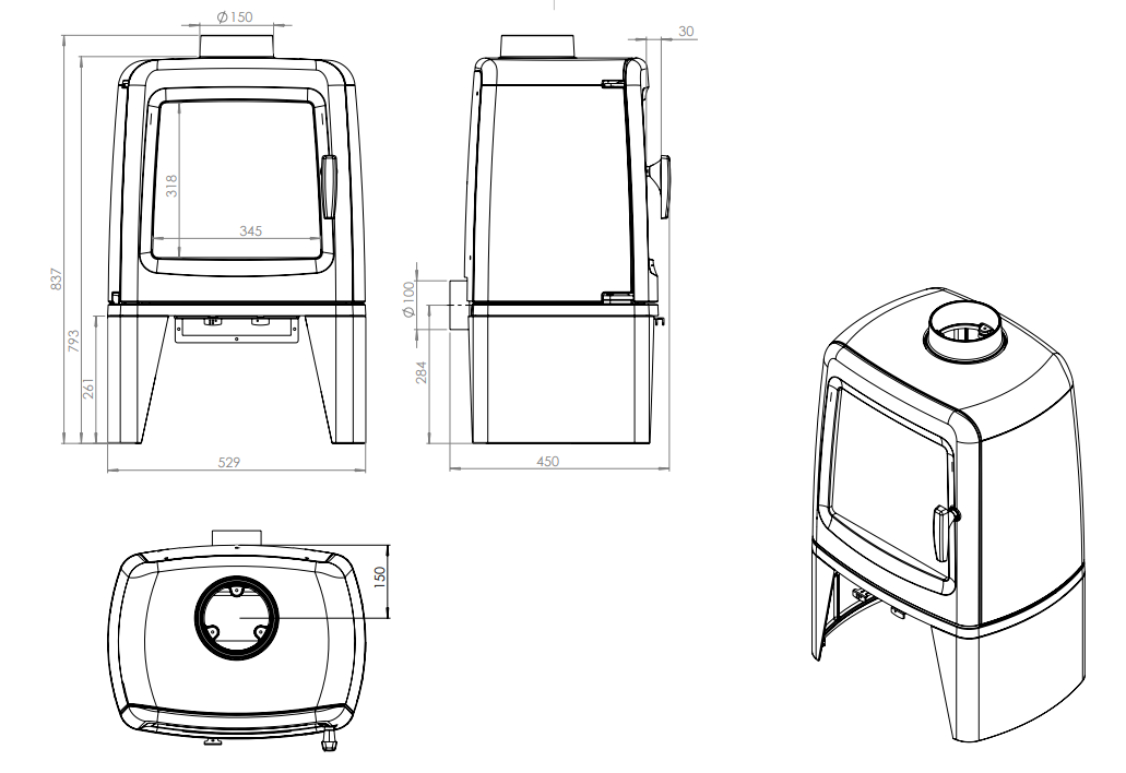Gietijzeren houtkachel met boven en achter aansluiting dia 150